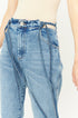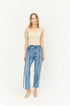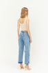 Pantalón en denim pierna recta y tiro alto. Cierre frontal cremallera y botón metálico. Bolsillos delanteros. Detalle de apertura en pretina y tiras de jeans.