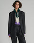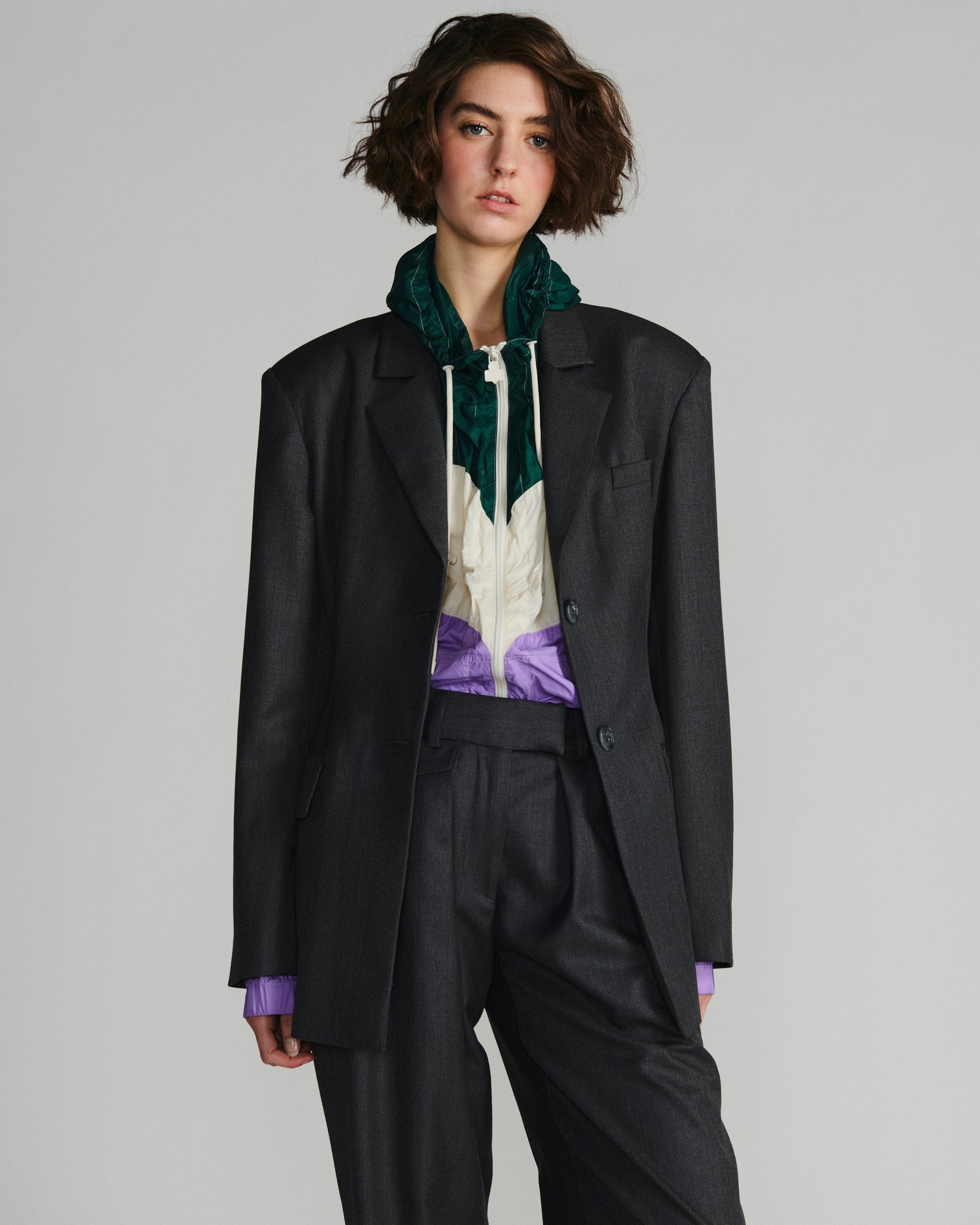 La prenda se caracteriza por su corte masculino y contemporáneo.