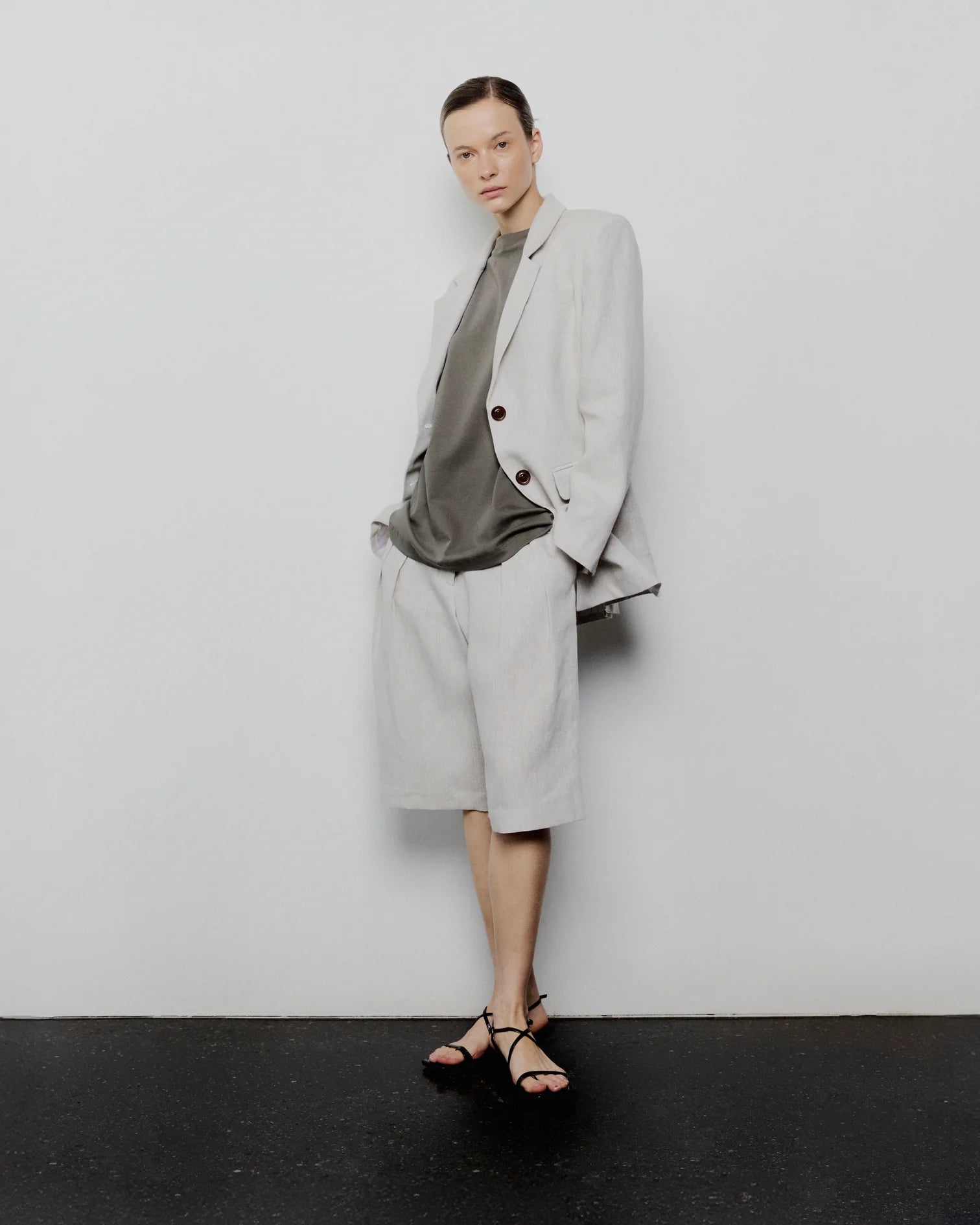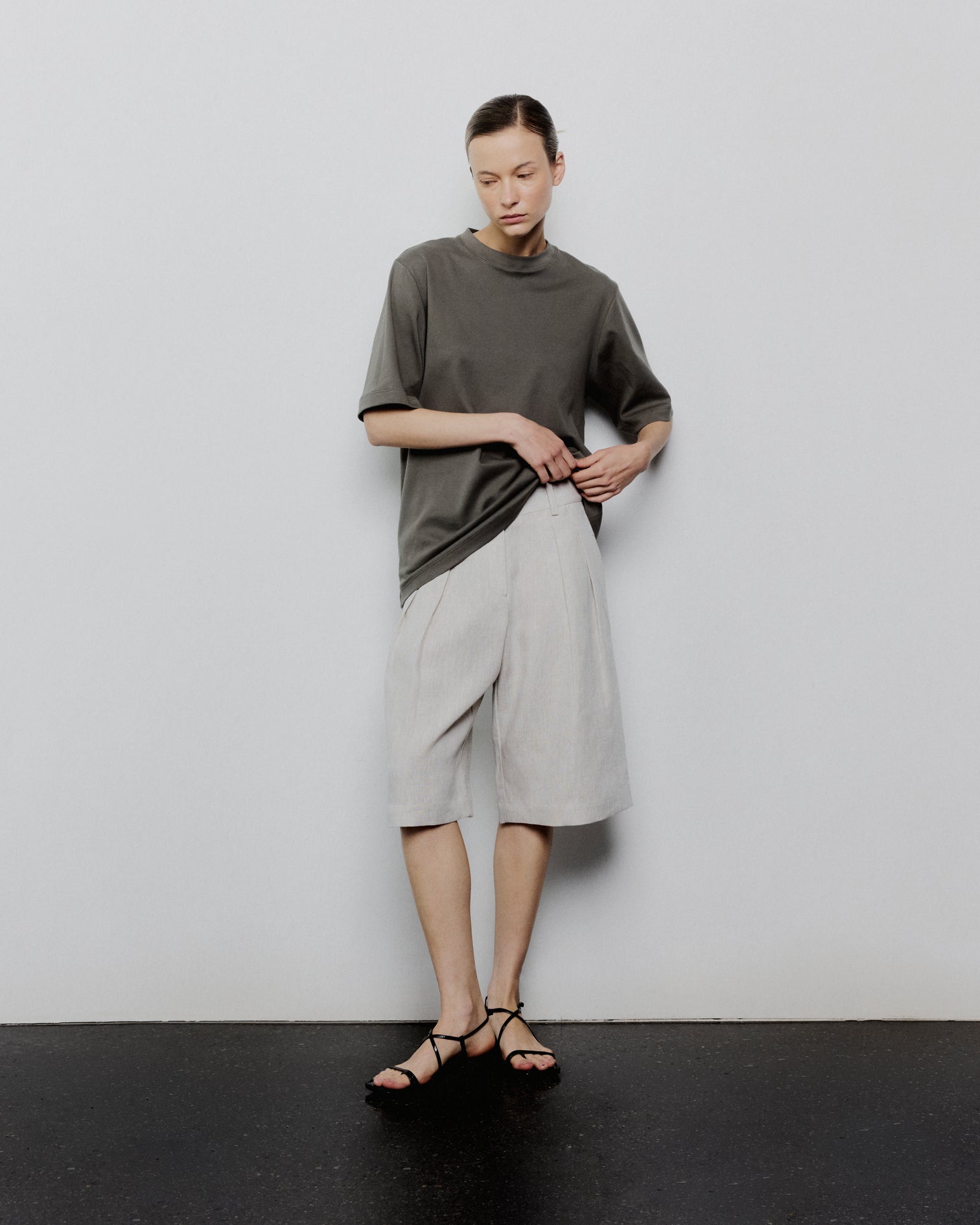 Bermuda con plizado delantero, cintura alta, pierna ancha y de corte holgado en 100% Lino y 100% Lana.