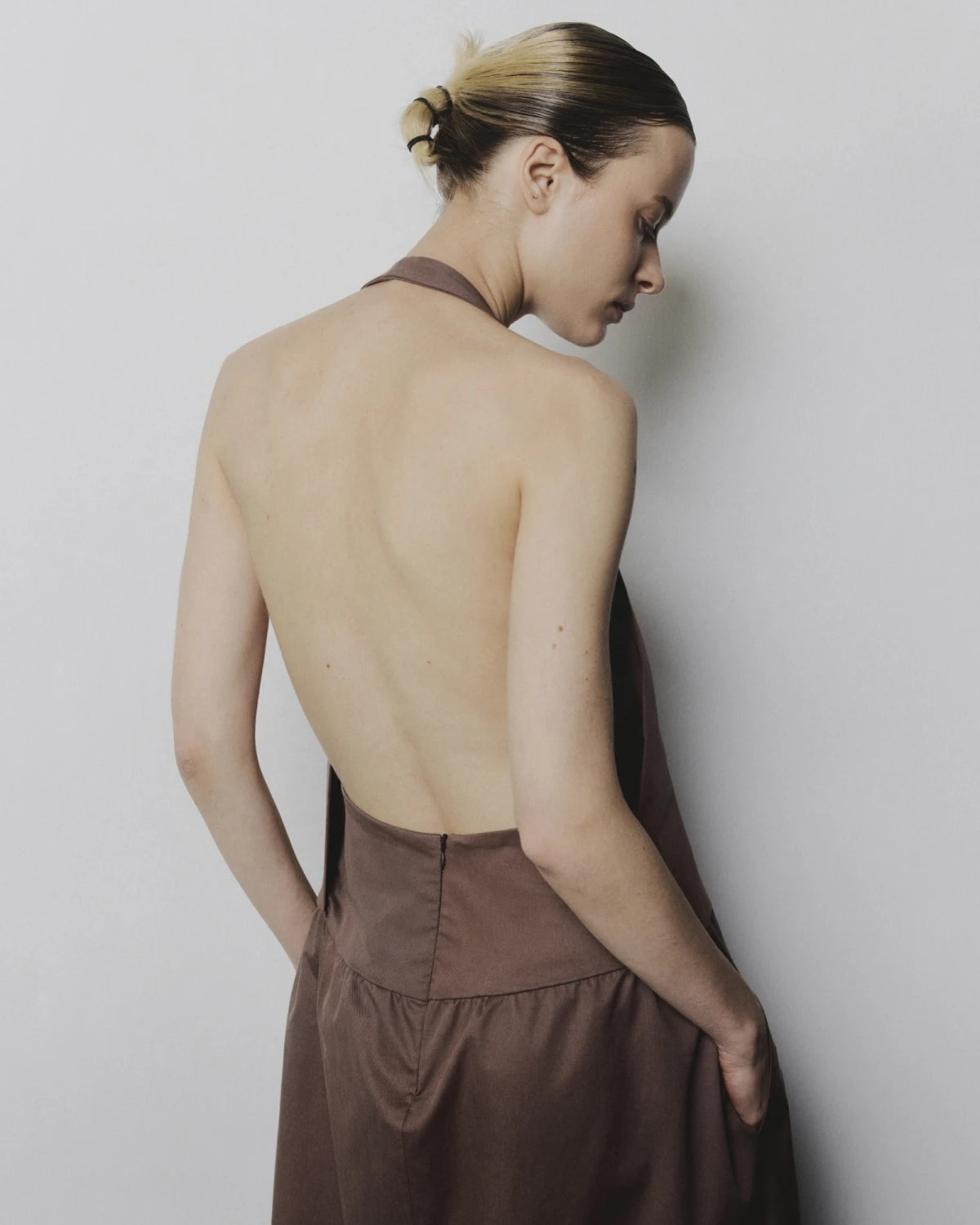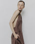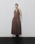 Vestido halter, hasta los tobillos con escote en v y pinzas en busto y caderas. Falda de corte amplio, que aporta movimiento. Un esencial de Aure 0001. Confeccionado en popelina o tencel 100% algodón.