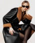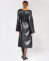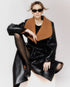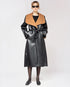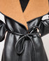 Maxi abrigo en eco cuero con chiporro interior. Solapas prominentes reversibles. Cruce frontal con botón y lazo. Bolsillos en costados.