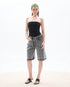 Bermuda 100% algodón, de tiro medio, pierna acampanada. Cierre frontal con cremallera y botón metálico. Detalles de encaje en delatero piernas.