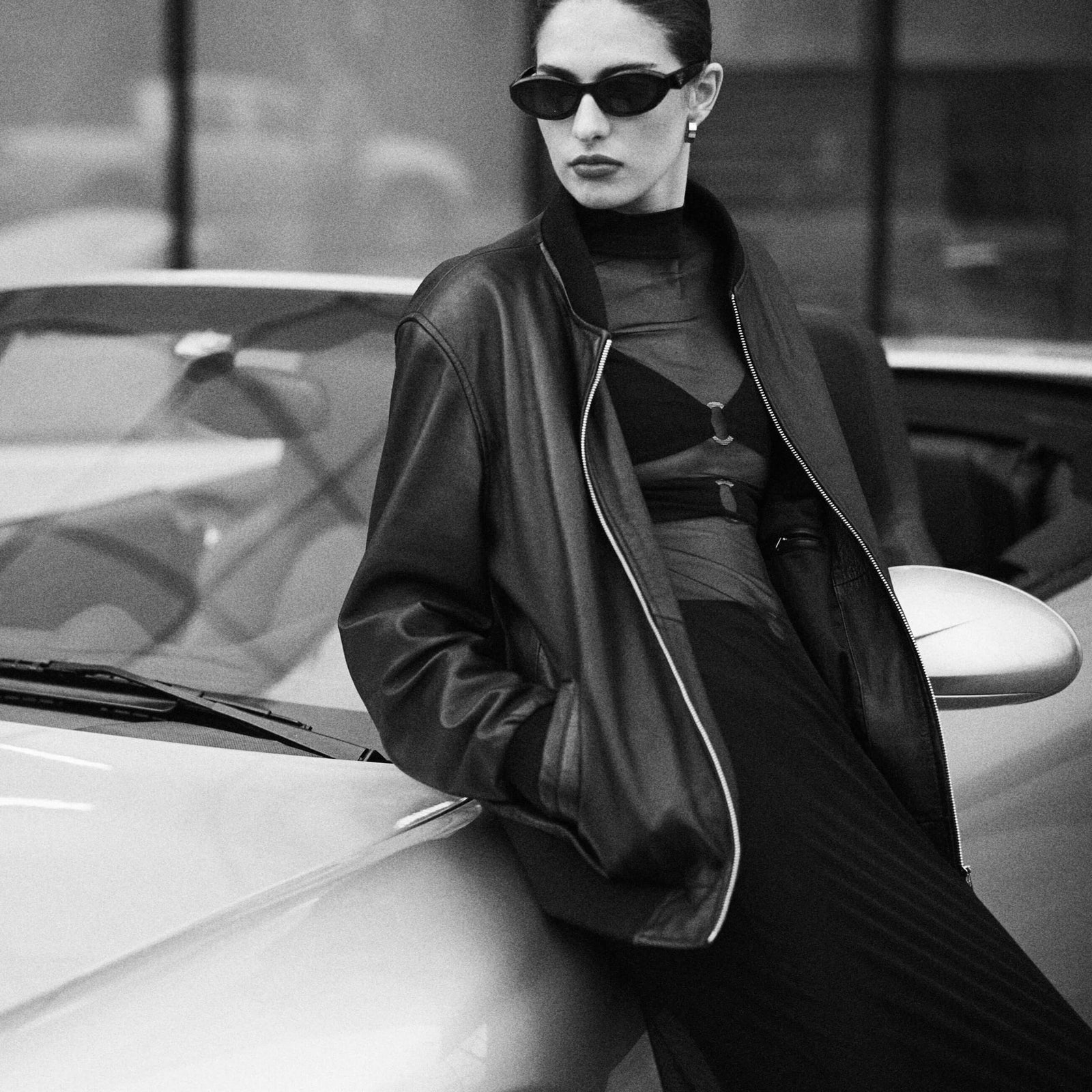 Chaqueta tipo Bomber color negro, 100% de cuero de oveja, suave y delgado. Cuello alto y con cierre en la parte delantera.