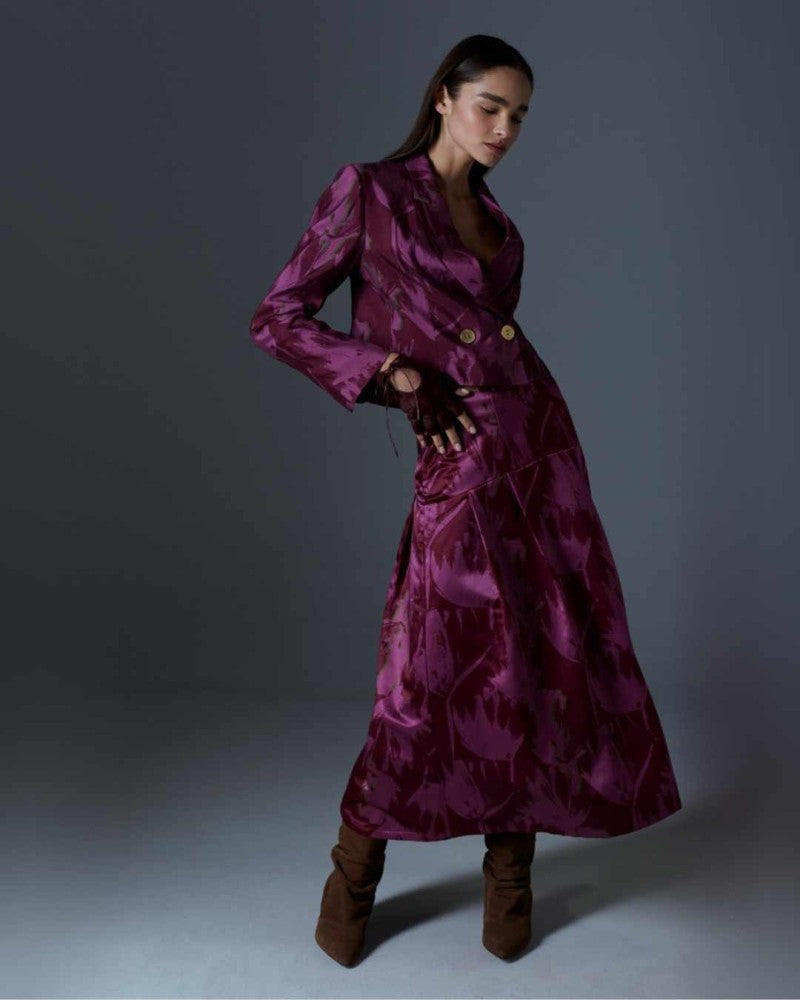 El Blazer Mónaco Dalí reinterpreta la sastrería con una mirada artística y decididamente contemporánea. Con la misma confección estructurada y cropped del clásico Mónaco de temporadas anteriores, esta versión se viste con un print floral abstracto en tonos burdeos y violeta profundo, creando una pieza de alto impacto visual. Sus botones dorados aportan el contraste preciso y elevan aún más su carácter editorial. Sofisticado, audaz y versátil, es ese blazer que transforma cualquier look y se vuelve imprescindible en un clóset con intención.