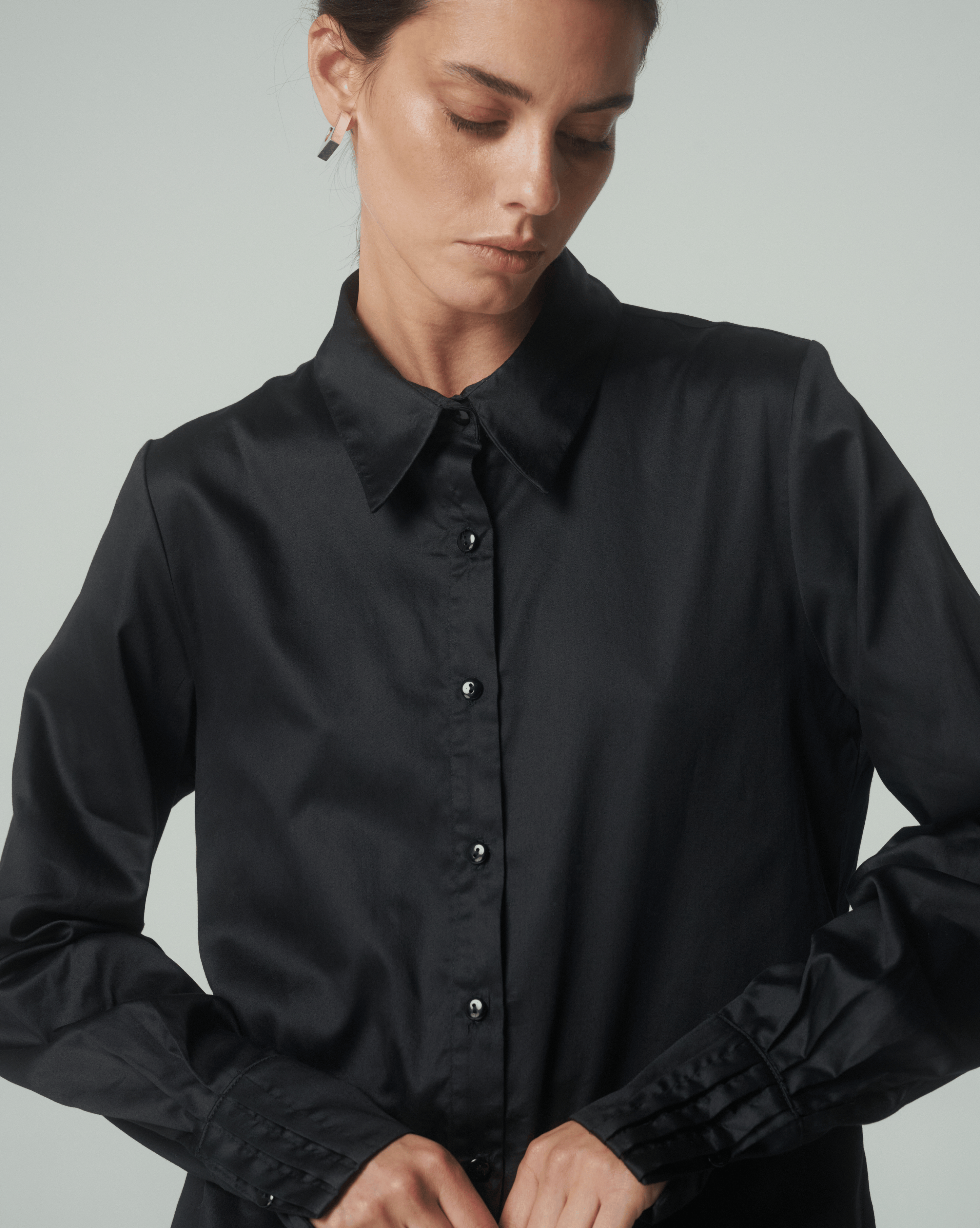De calce relajado, presenta cuello clásico, cierre frontal con botones y un delicado plisado en los puños que añade un sutil acento de diseño.