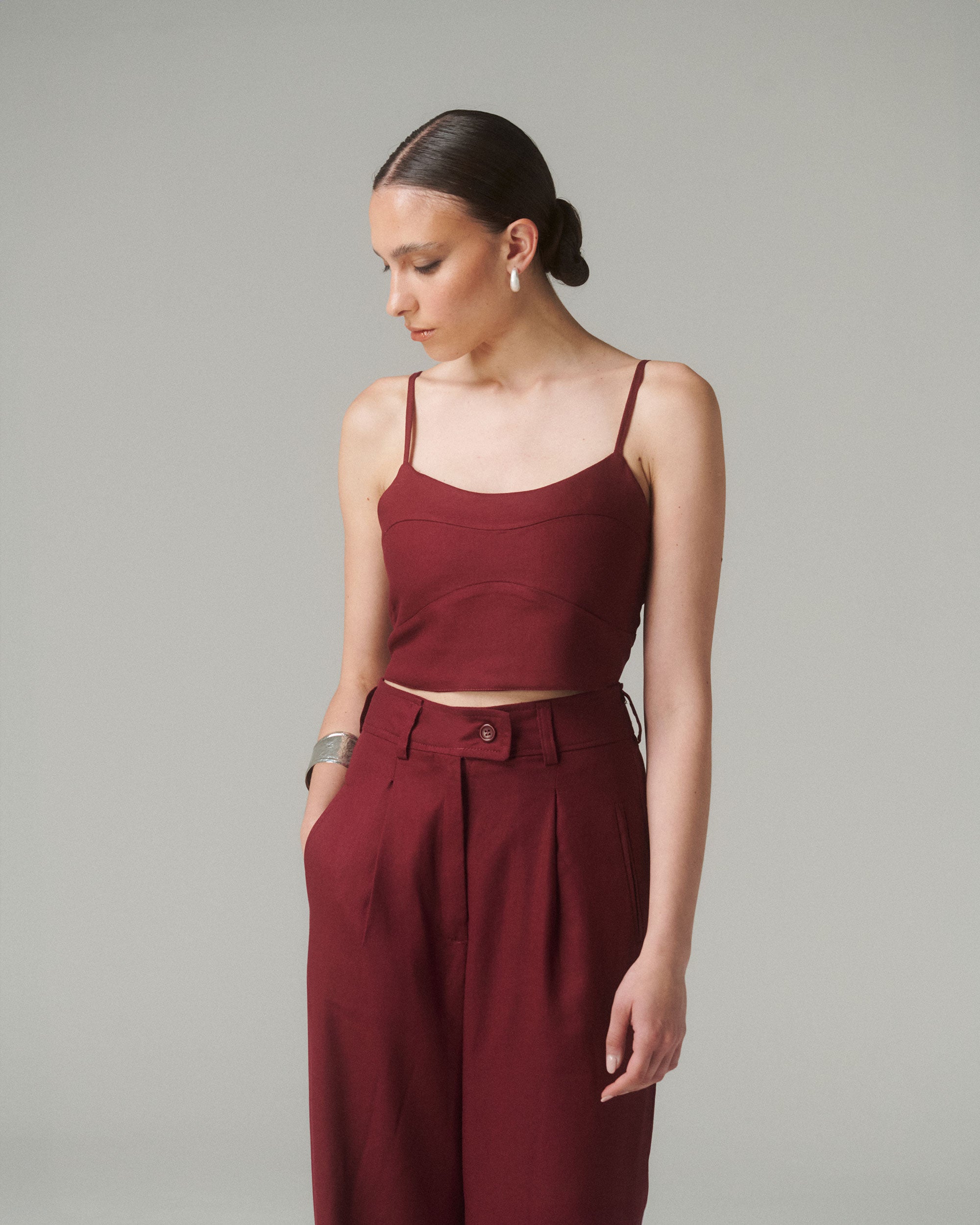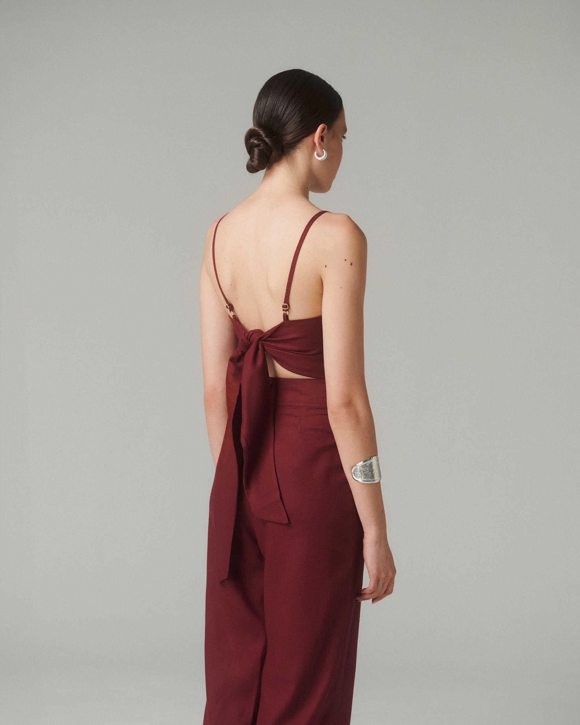De escote recto y tirantes finos con breteles regulables, destaca por su espalda abierta con lazo ajustable que permite adaptarla al cuerpo.