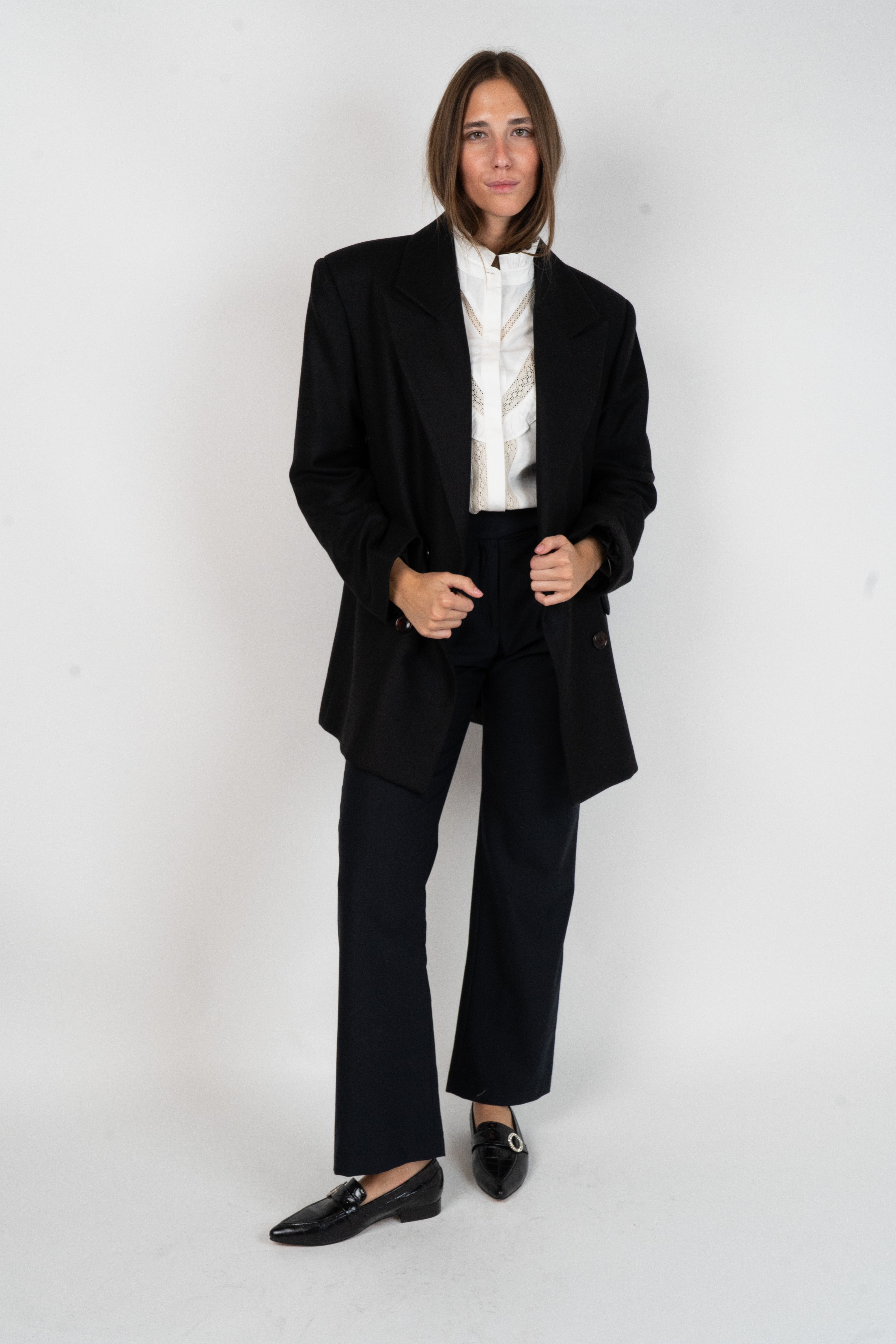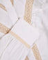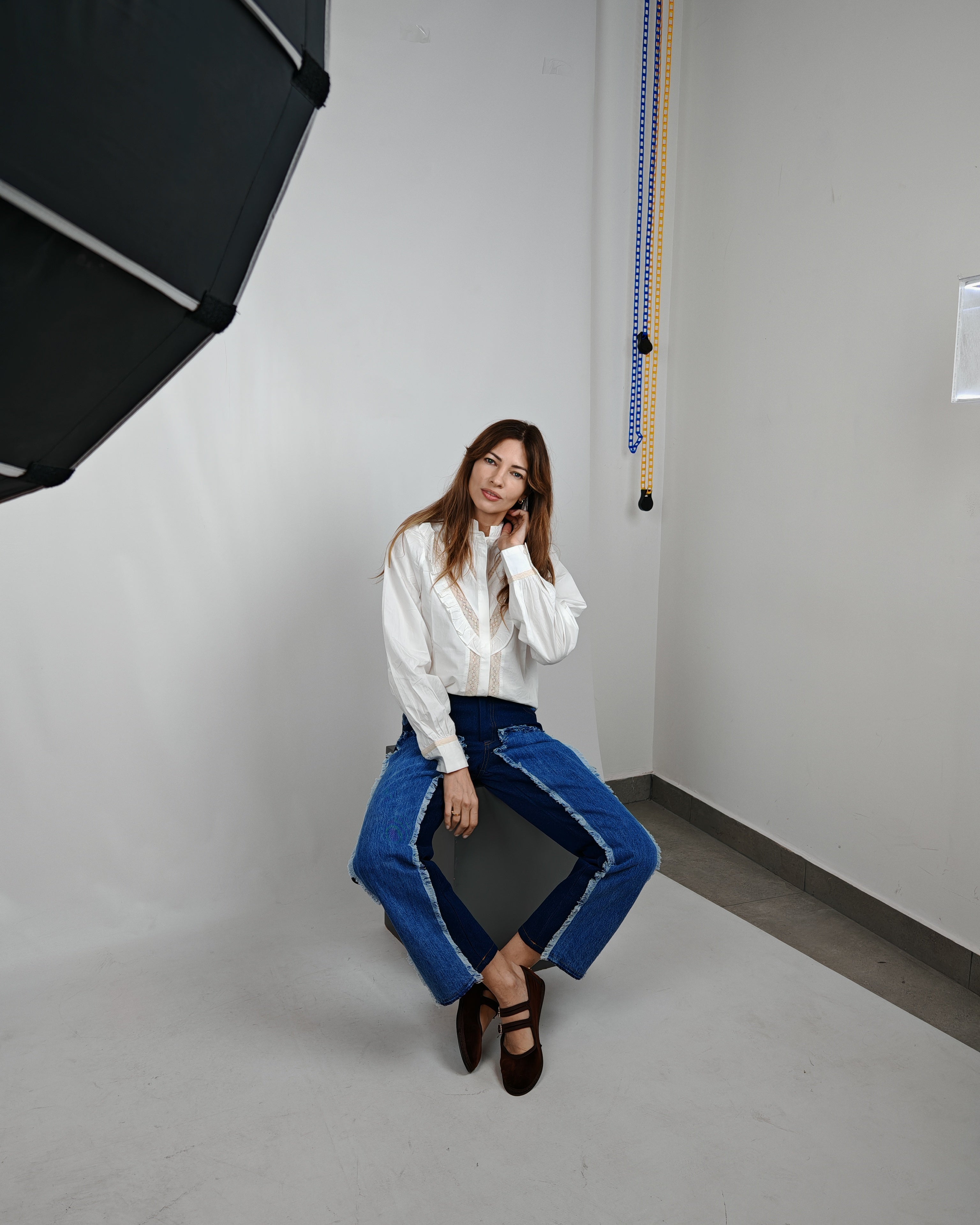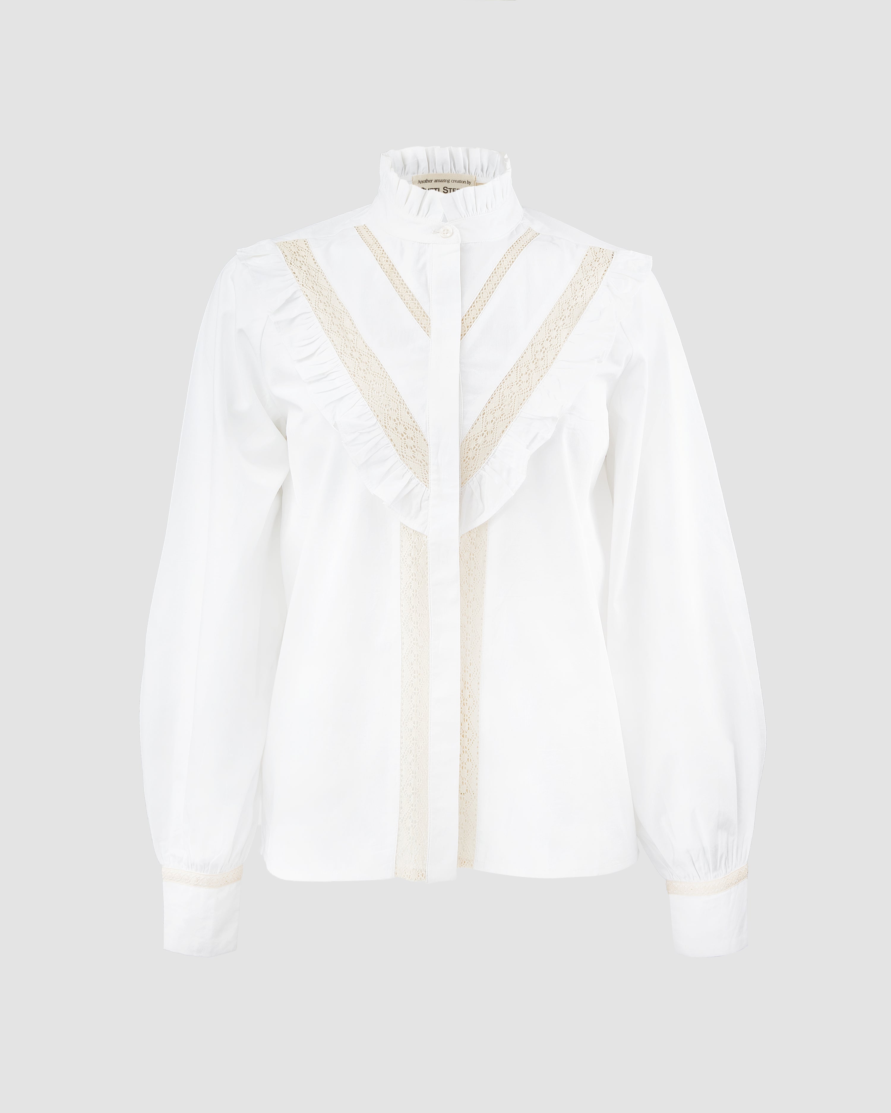 Camisa de popelín de algodón, color celeste y detalles en encaje de algodón a contratono. Con manga larga, puños y cuello altos.