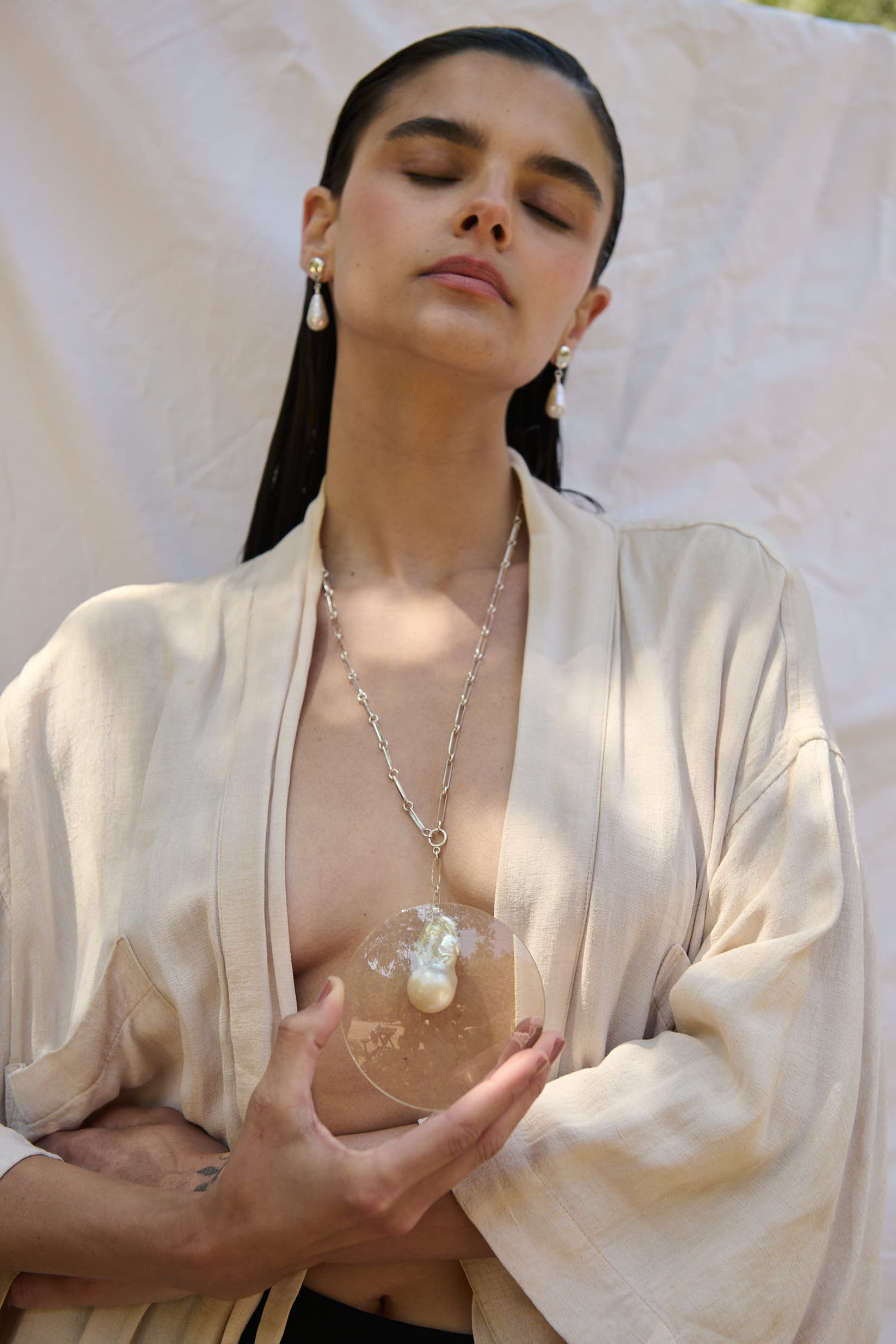 Diseñado como parte de la colección MORPH, combina la elegancia clásica de la perla barroca blanca con la artesanía moderna.
