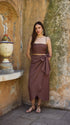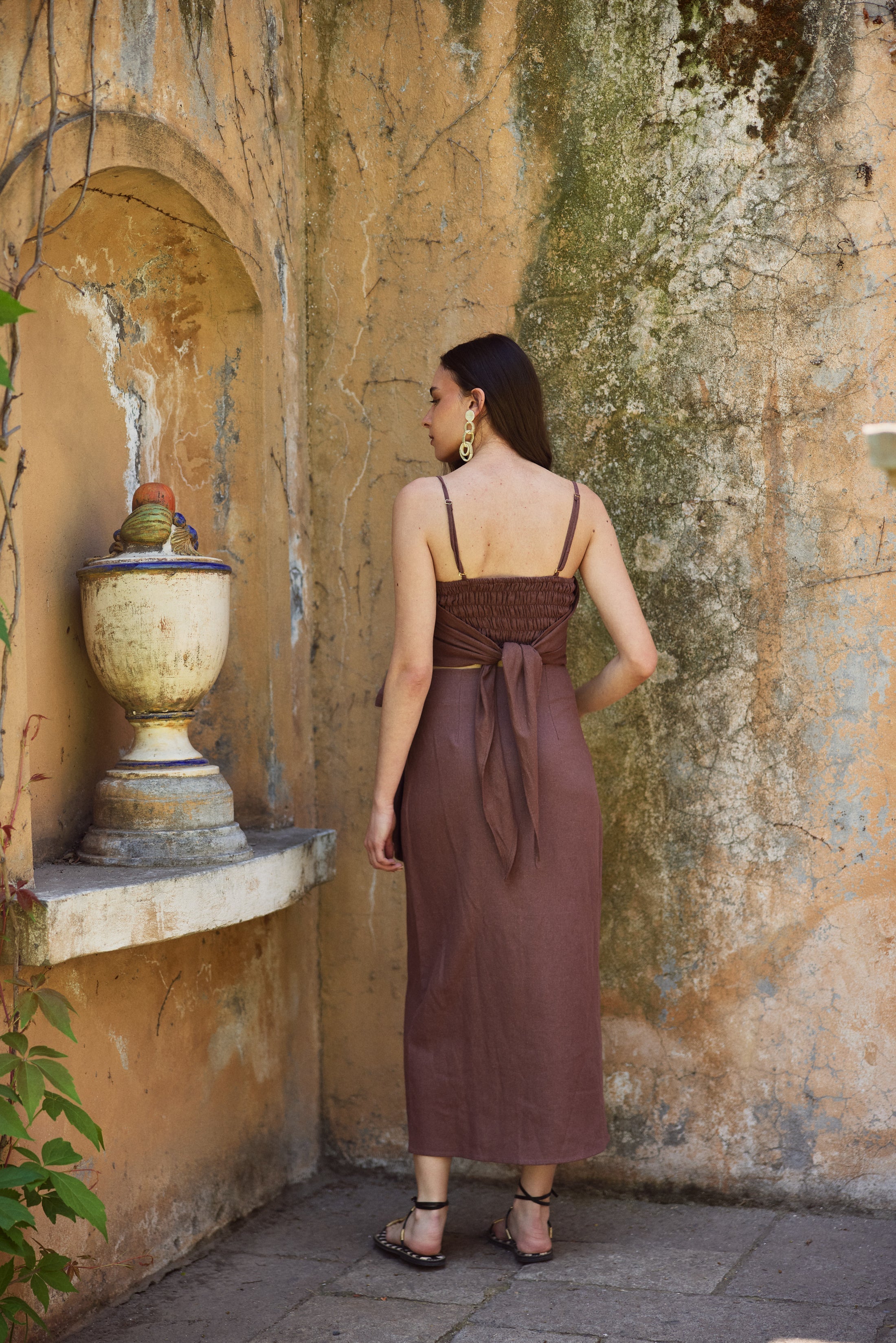 La Falda Antonia destaca por su silueta femenina y adaptable. Tiene botones internos para ajustar la talla. Su diseño envolvente permite libertad de movimiento y un ajuste perfecto. Ideal para combinar con blusas o tops de lino, creando conjuntos elegantes que transitan sin esfuerzo del día a la noche.