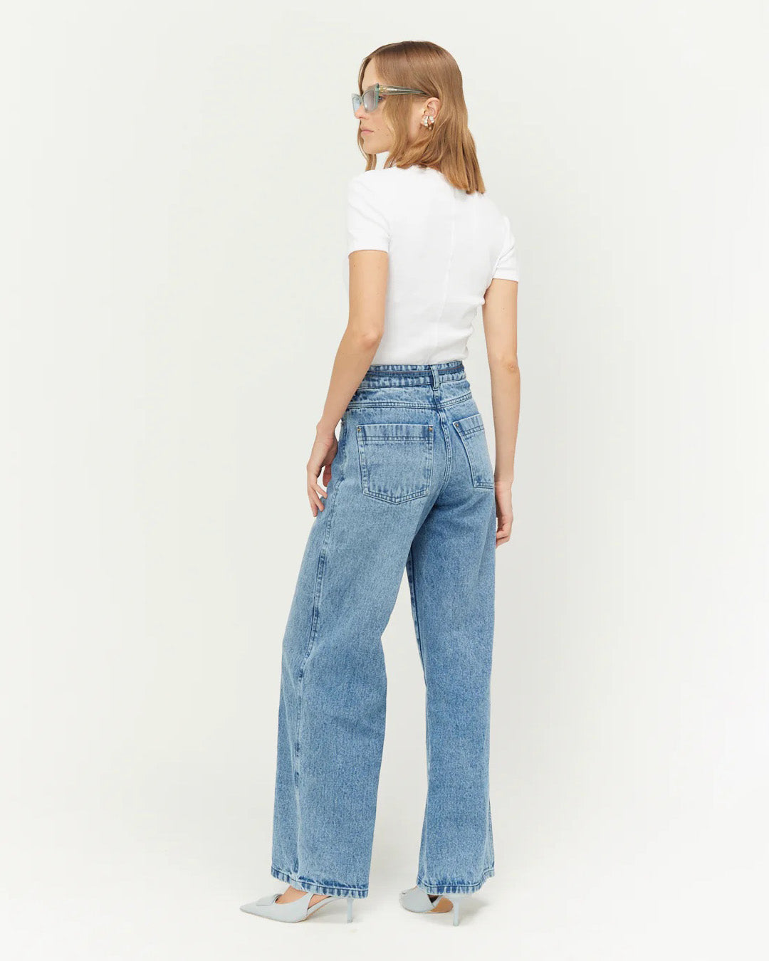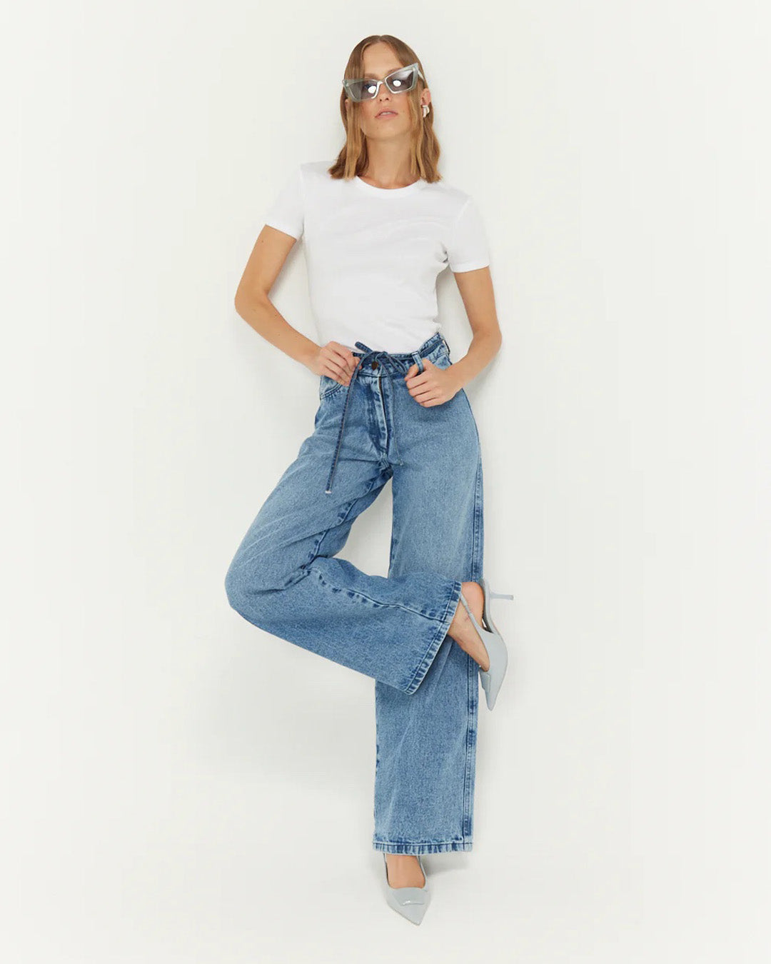 Pantalón en denim pierna ancha y recta y tiro alto. Cierre frontal cremallera y botón metálico. Bolsillos delanteros. Detalle amarra/cinturón de denim en pretina.