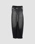 Jeans tiro medio y pierna abombada en 100% algodón. Efecto desgastado en piernas. Detalle de pretina en V. Cierre frontal con cremallera y botón metálico.