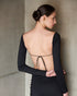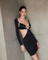 LILI es un hermoso vestido negro con mangas largas, tirantes ajustables, en espalda y detalle frontal de tiras cruzadas