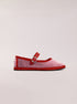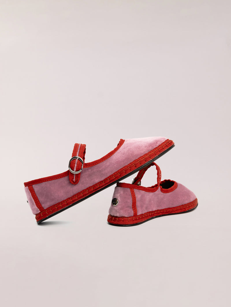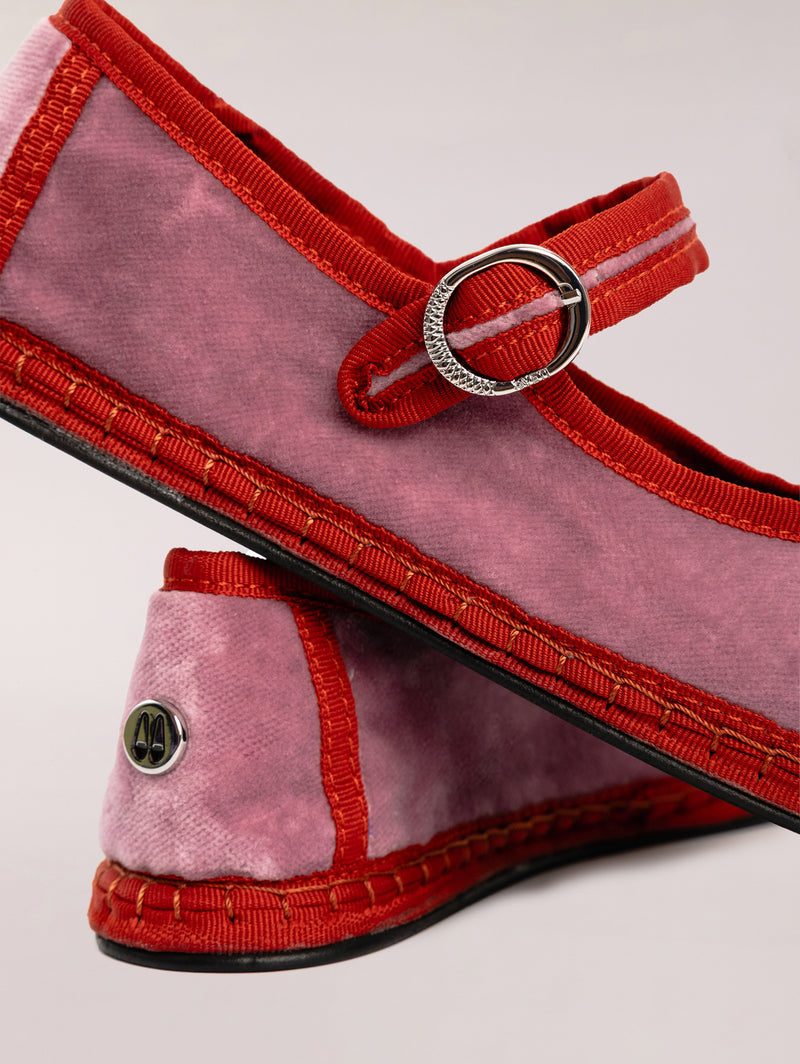 Las Mary Jane Camelia, uno de nuestros modelos más icónicos, están confeccionadas con un tejido exterior compuesto 100% en terciopelo de algodón en tono rosa chicle, en contraste con el ribete en color rojo. Es un modelo alegre que está diseñado para elevar tus looks más veraniegos.