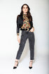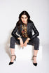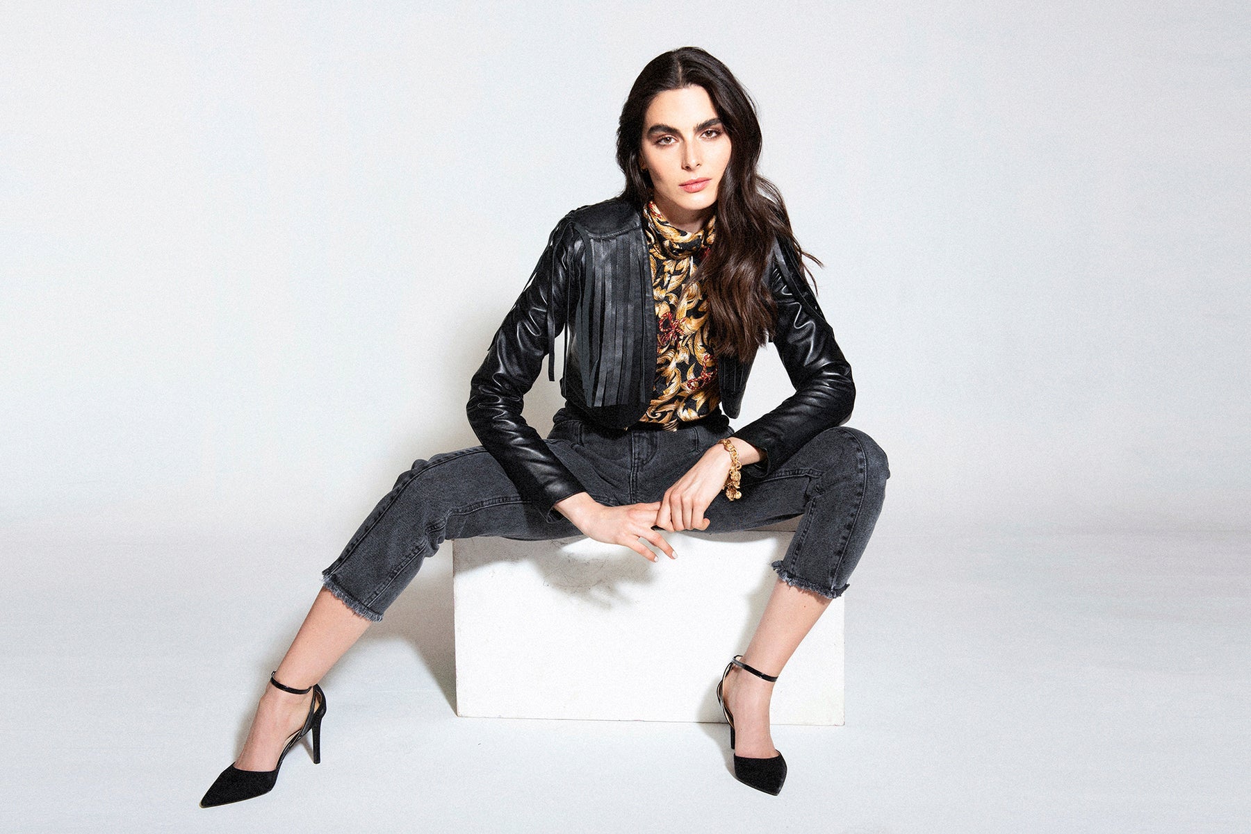 Chaqueta a la cintura con terminaciones redondas, con flecos en frente, manga y espalda. Sin cierre ni botones.