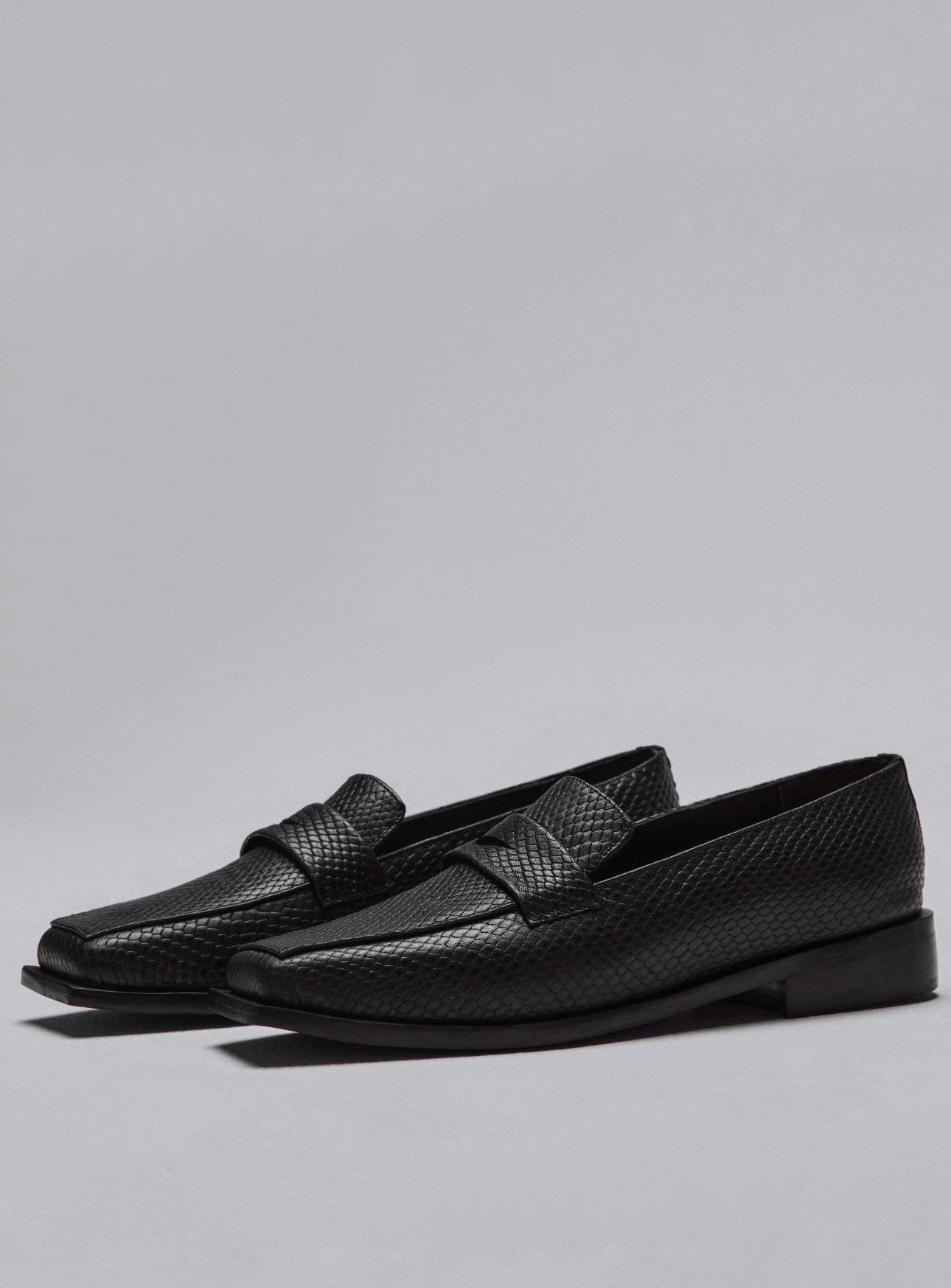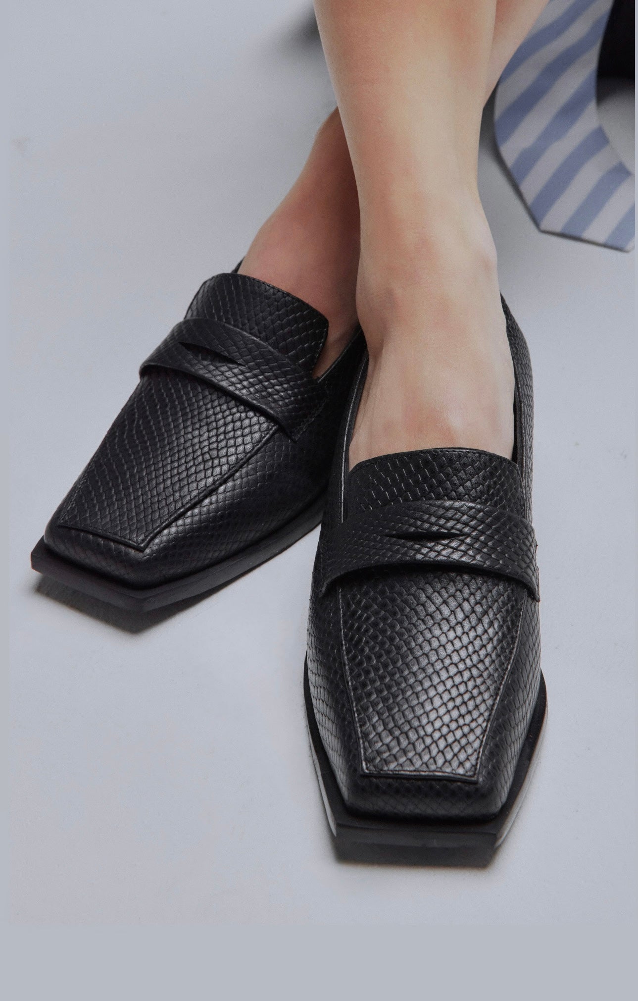 Clásico, pero con un twist. Agustina es nuestro mocasín de espíritu vanguardista que se impone con personalidad propia. Hechos en un cuero negro texturado que aporta estilo y carácter, destacan por su punta cuadrada extendida, un detalle moderno que estiliza y marca la diferencia. Cómodos, versátiles y con actitud, estos mocasines están pensados para acompañarte desde la oficina hasta una salida, sin perder estilo en el camino. Agustina es ese modelo único que transforma lo cotidiano en algo especial.