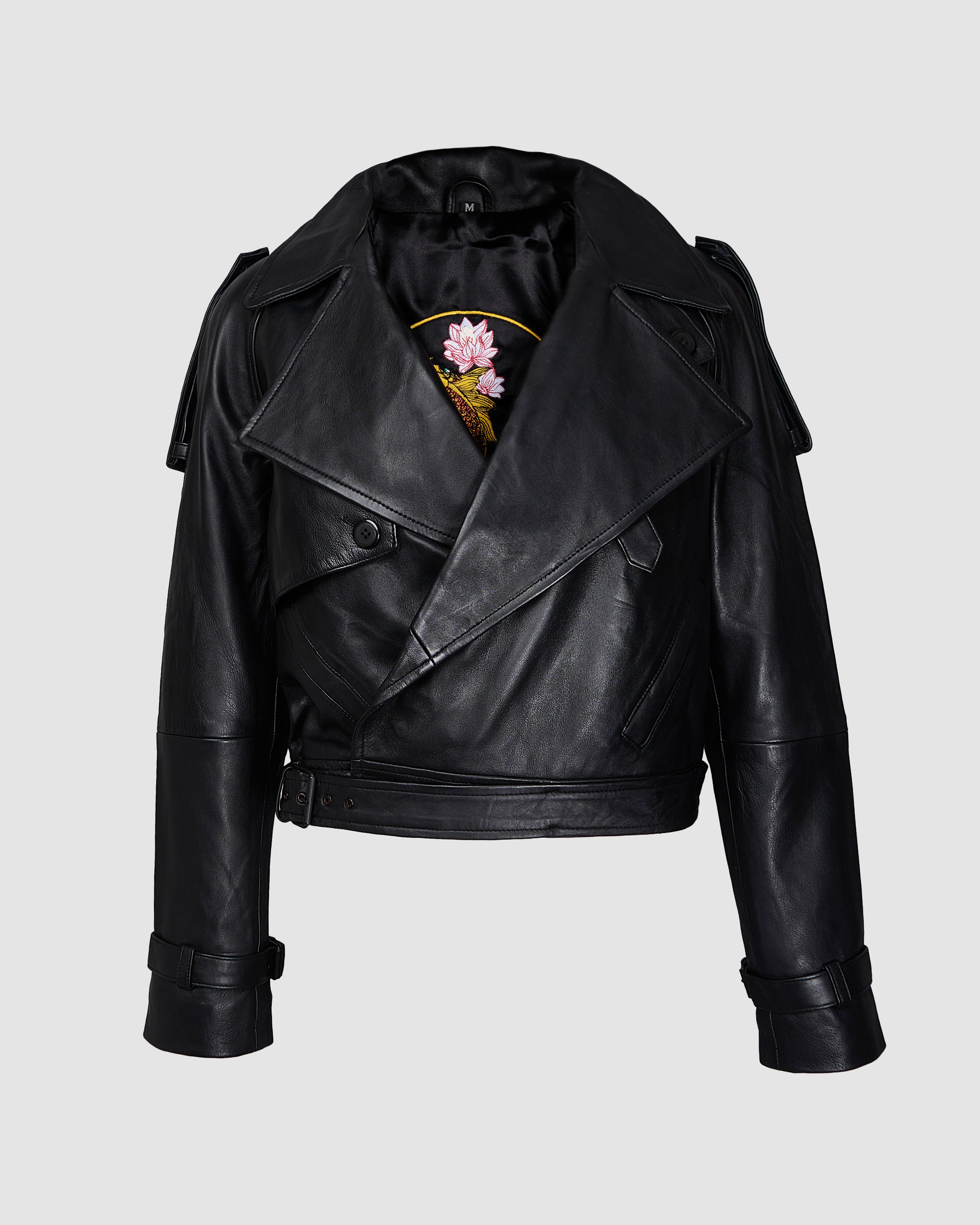Composición: 100% cuero de ovino traído de Turquía, forro de seda 100% bordado, botones plateado brillante con lienzo tipo cinturón removible. Chaqueta corta.