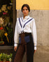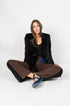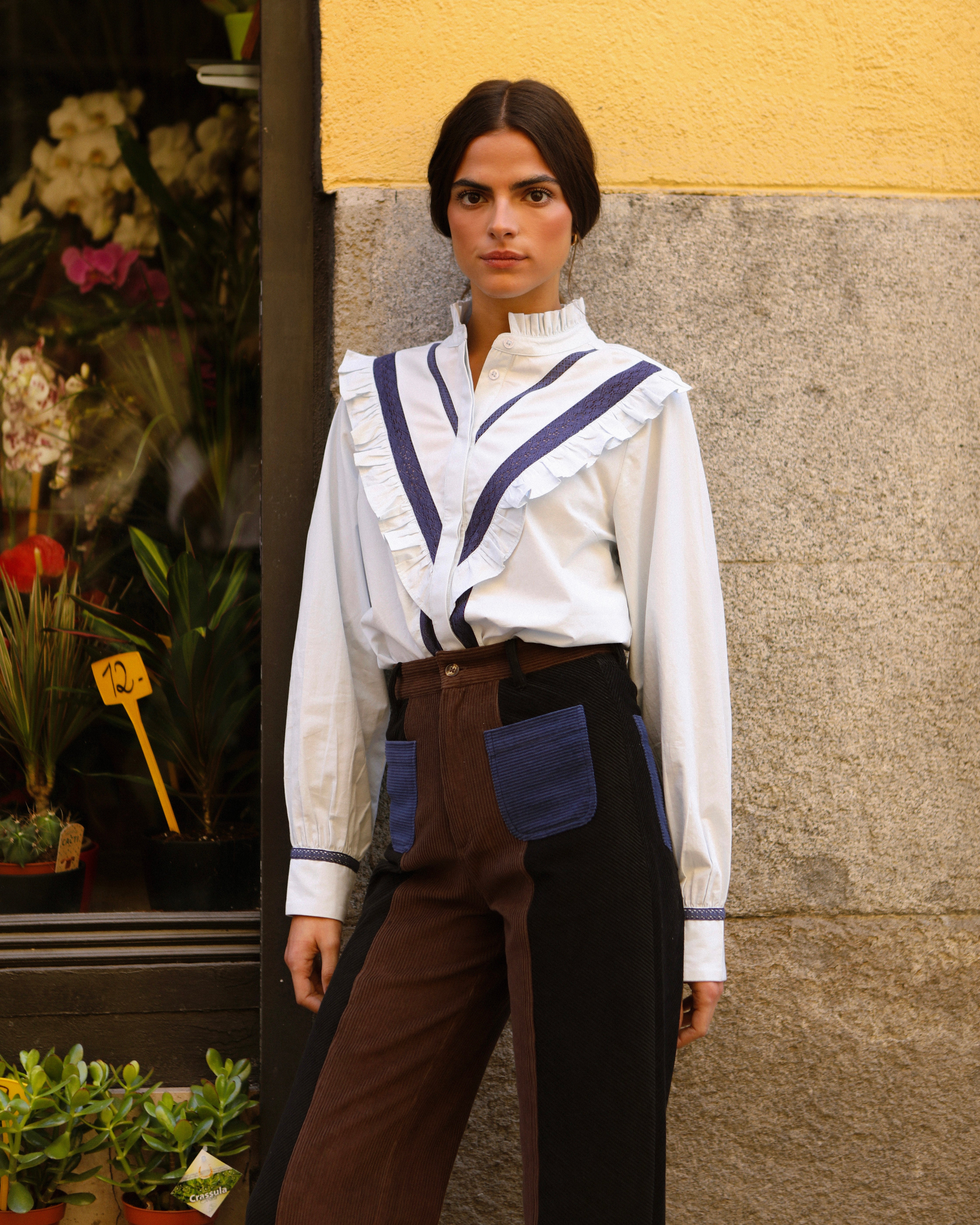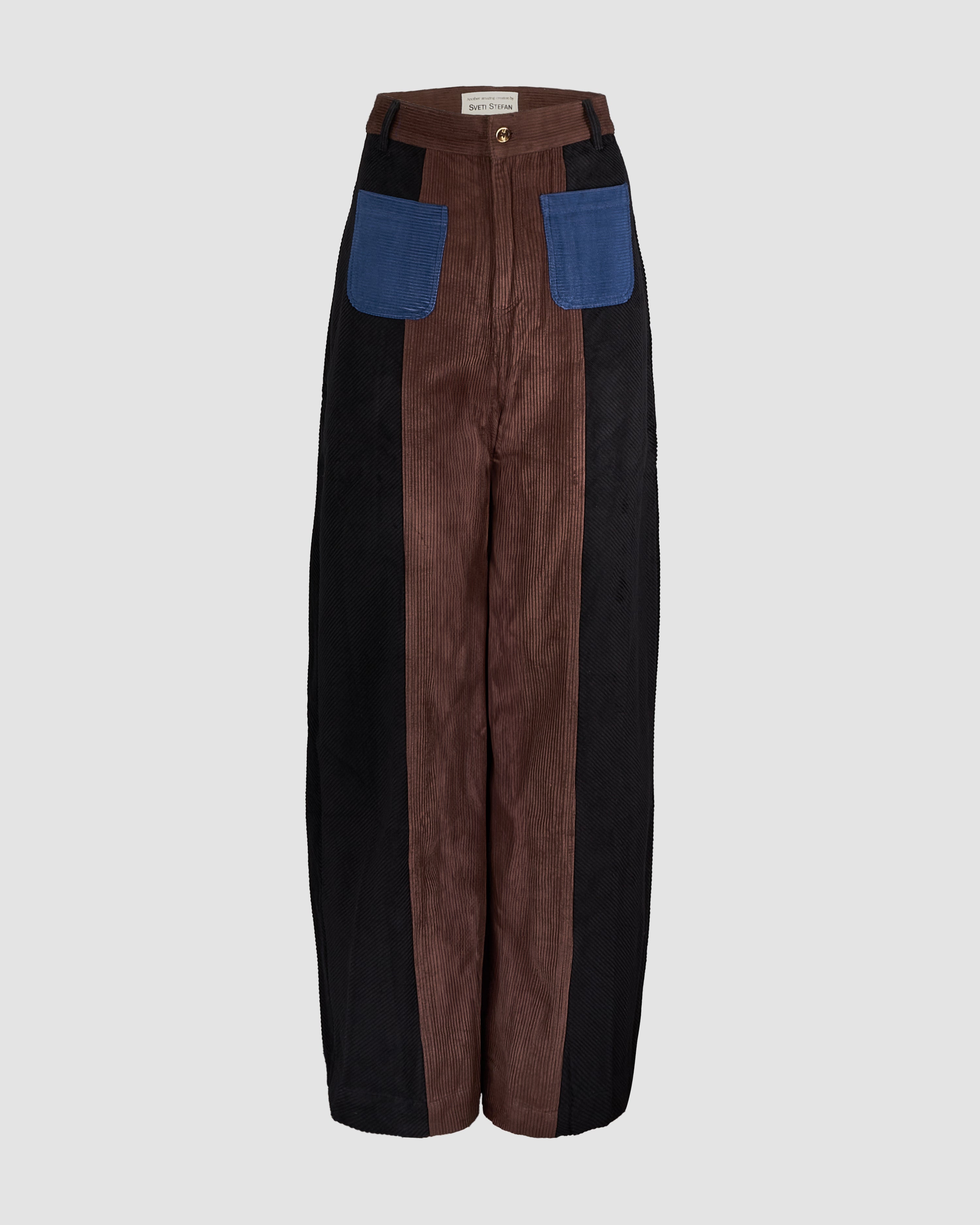 Pantalón bicolor de pana 100% algodón. Cintura alta y bolsillos aplicados a contratono.