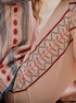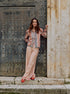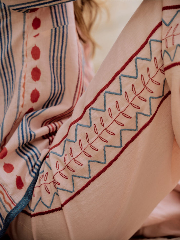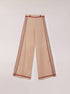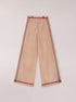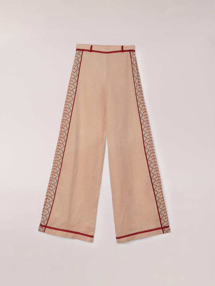Pantalón con bordados laterales con motivos geométricos y orgánicos. Color maquillaje y corte recto. Compuesto de fibras naturales como el algodón y el lino. Trabillas a contraste en color naranja. Bajo rematado con hilo naranja en consonancia con las trabillas del cinturón. Botón y cremallera ocultos.