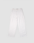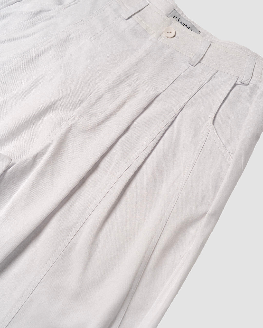 Este pantalón está confeccionado en algodón 100%, lo que le aporta estructura y suavidad. De tiro alto y corte recto, presenta pinzas delanteras que entregan amplitud a la silueta y una pretina ancha que define la cintura con elegancia.