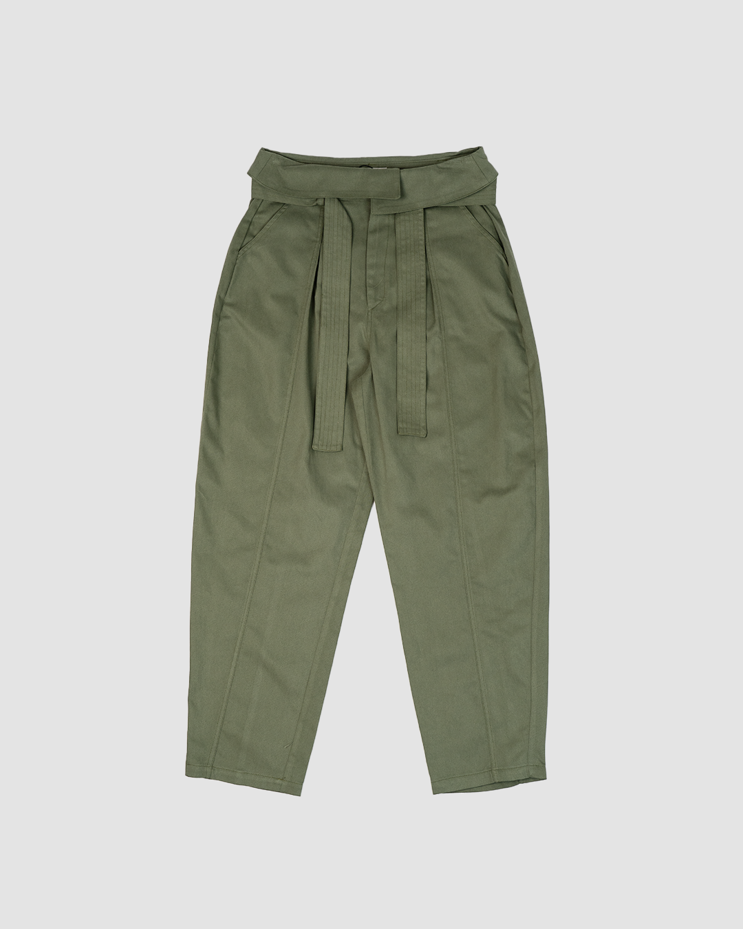Este pantalón está confeccionado en algodón 100%, lo que le otorga una textura firme pero cómoda, ideal para el uso diario. De corte recto y tiro alto, incorpora pinzas frontales que estructuran la silueta y un cinturón del mismo tejido que permite ajustar la prenda a la cintura.