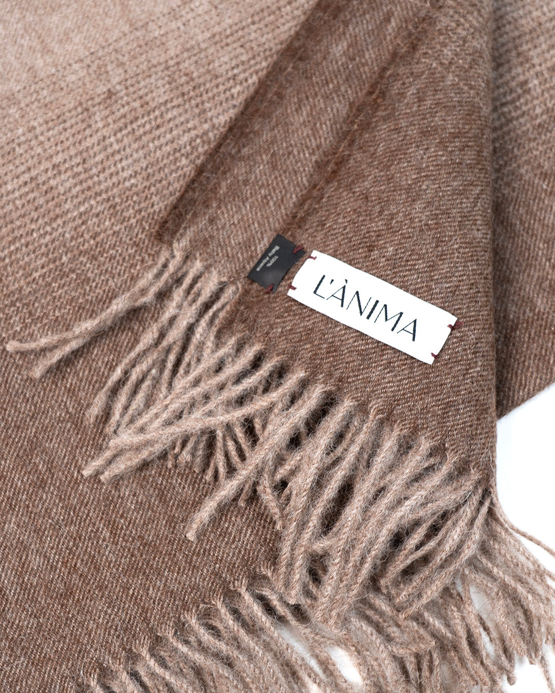 Esta pashmina, tejida en 100% baby alpaca, destaca por su textura suave y ligera.