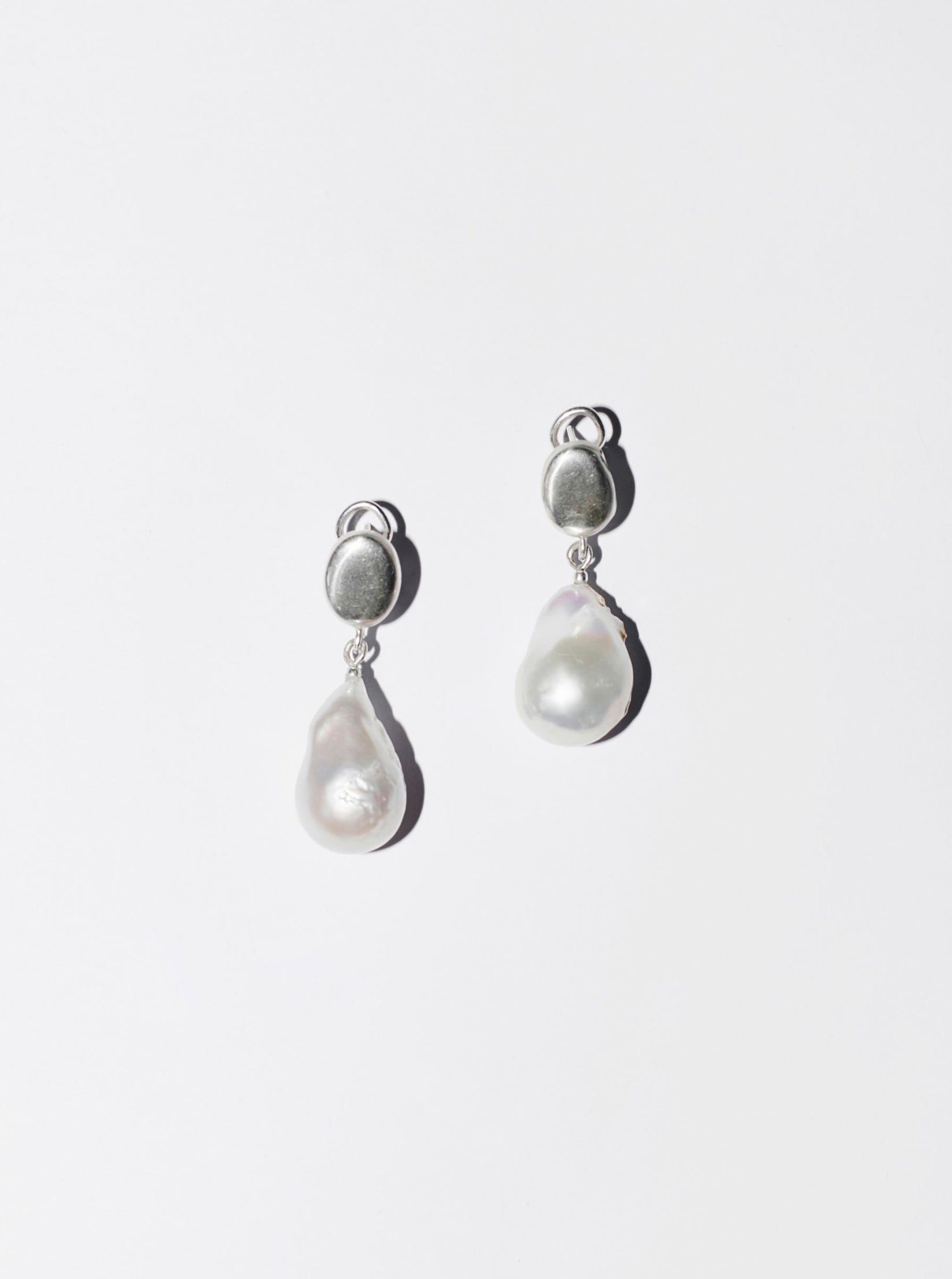 Diseñado como parte de la colección Escencial. Par de aros tipo colgantes de perlas barrocas, esculturales. Cada perla es única, por lo que ocurrirán variaciones en el tamaño y la forma de las perlas.