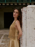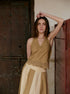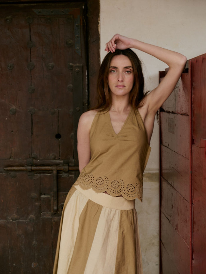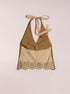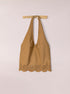 Top espalda descubierta y atado al cuello. Disponible en fresa y en beige. Lazada superior para ajustar el diseño. Escote en pico y con frunce central. Corte ajustado y con bajo bordado manualmente con motivos florales en el mismo tono del tejido. Bajo acabado con formas semiesféricas.