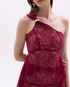 Top asimétrico de encaje transparente con tiras. Incluye bra interior color piel. No incluye broche metálico, este fue utilizado para el estilismo de la fotografía.