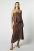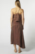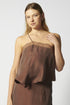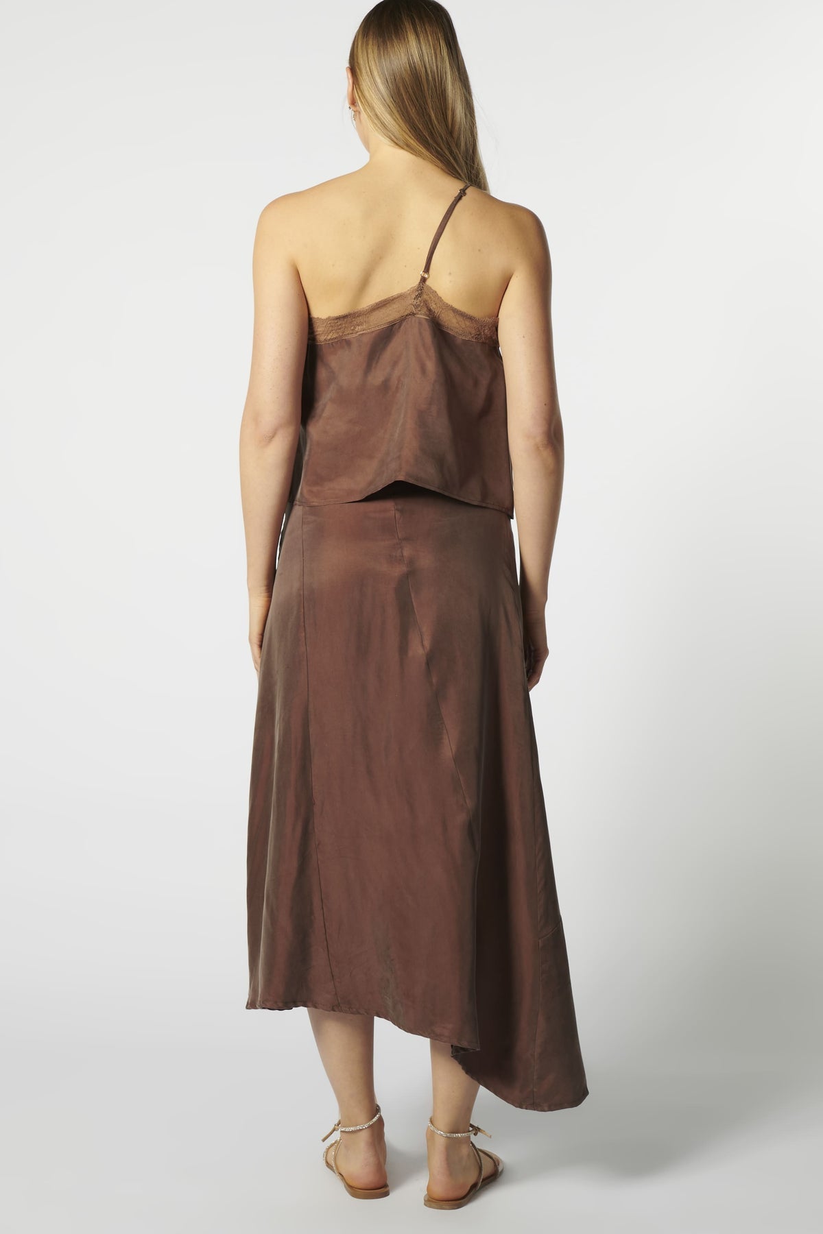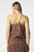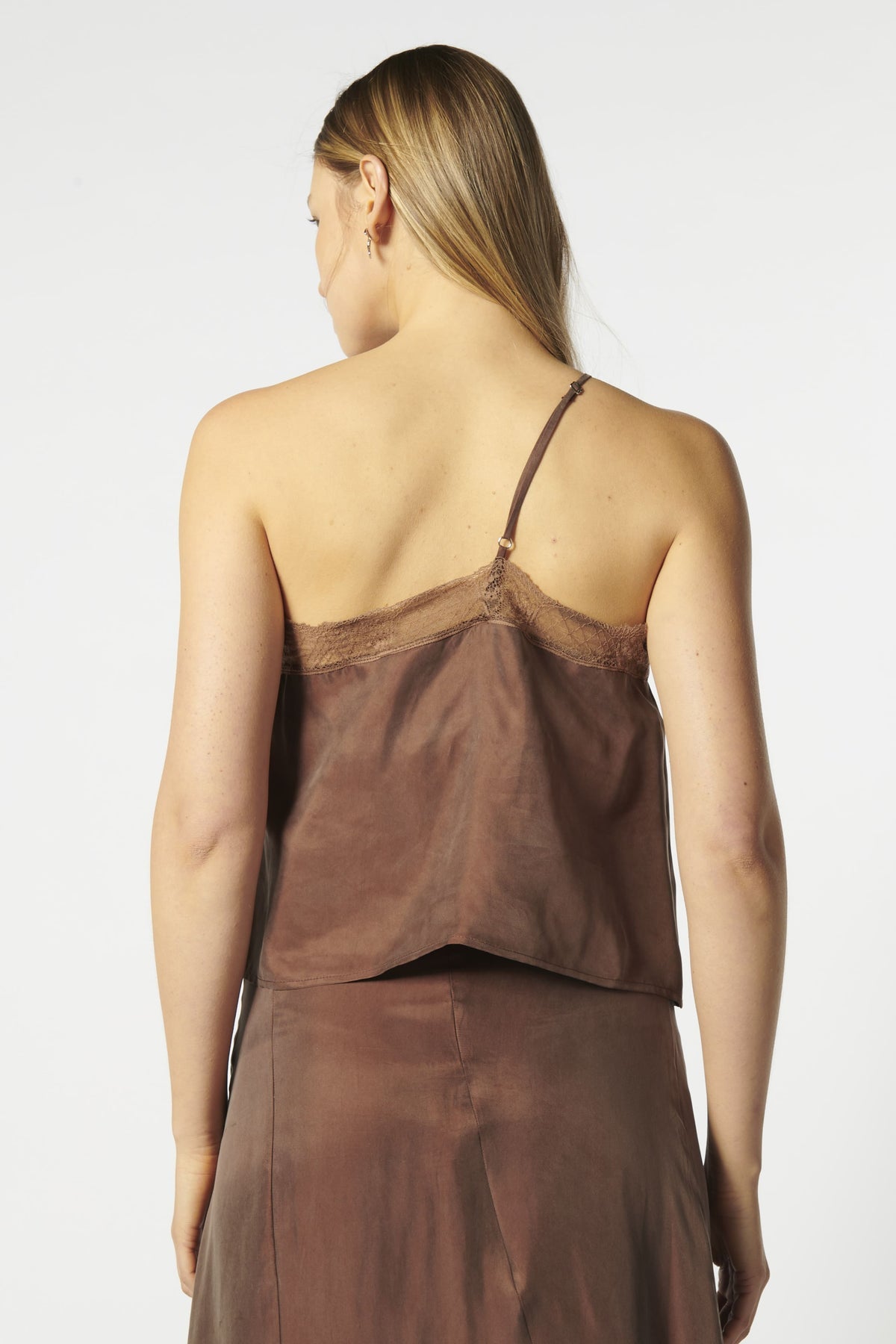 Top lencero de textura suave y caída fluida, con escote con detalle en encaje, tirantes delgados ajustables y corte asimétrico que aporta movimiento y originalidad. Confeccionado en una mezcla de cupro y viscosa, destaca por su brillo sutil y tacto sedoso. Incluye sujetador interno con elástico para mayor comodidad y sujeción. Ideal para usar solo o como base bajo blazers o camisas abiertas.
