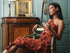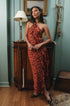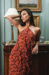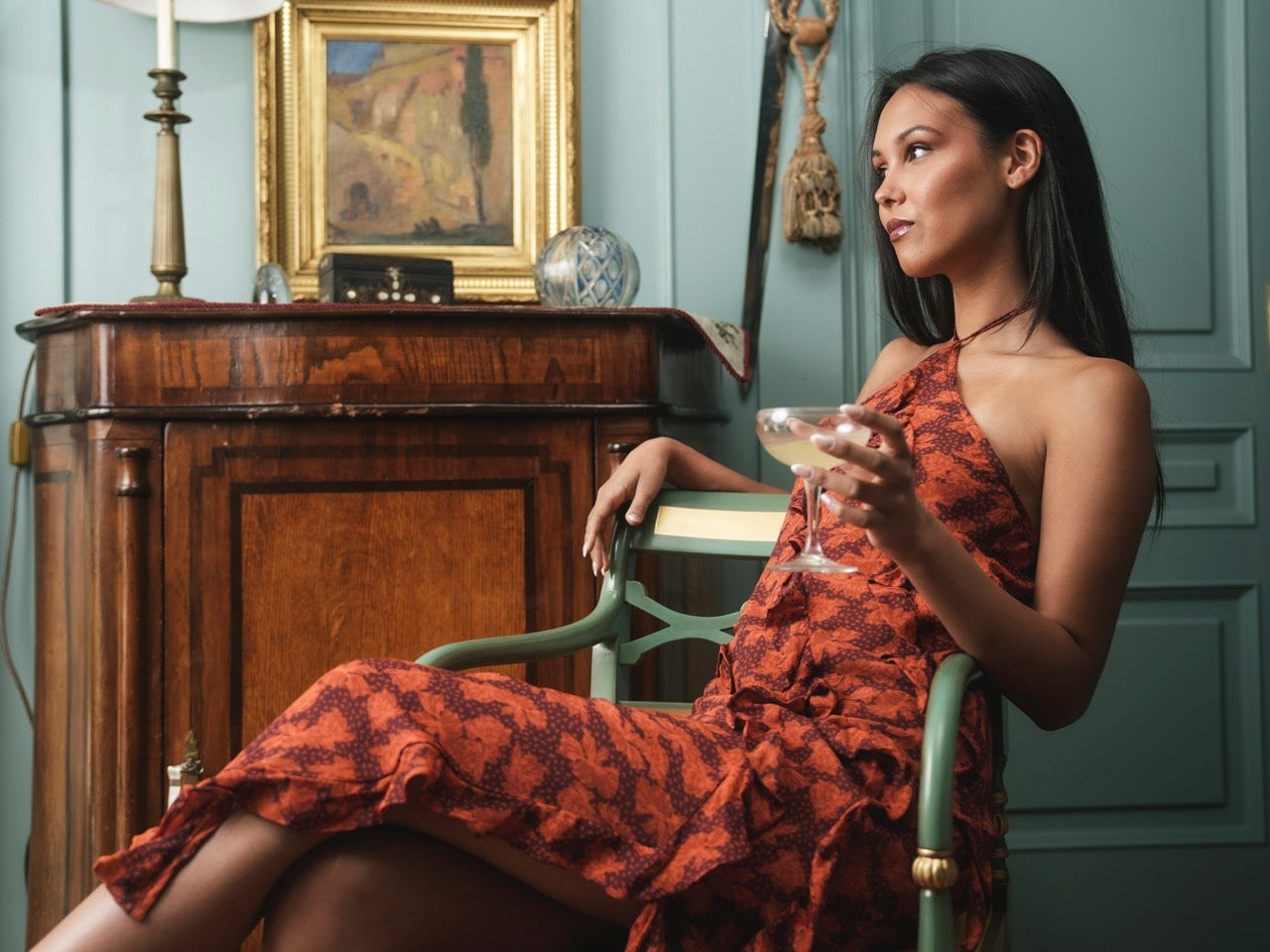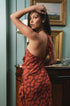 Maxi vestido de escote halter con detalle de volantes diagonales estilo romántico. Amarrado al cuello con pabilos terminados en vuelos. Abertura lateral en el bajo delantero.