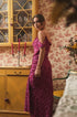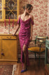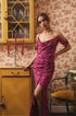 Máxi vestido de escote off shoulder con detalle de drapeado y cola a la cadera.