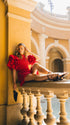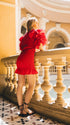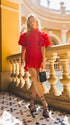 Vestido corto panal, con cuello con detalle de tablas y falda termina en vuelo. Mangas con volumen de vuelos.