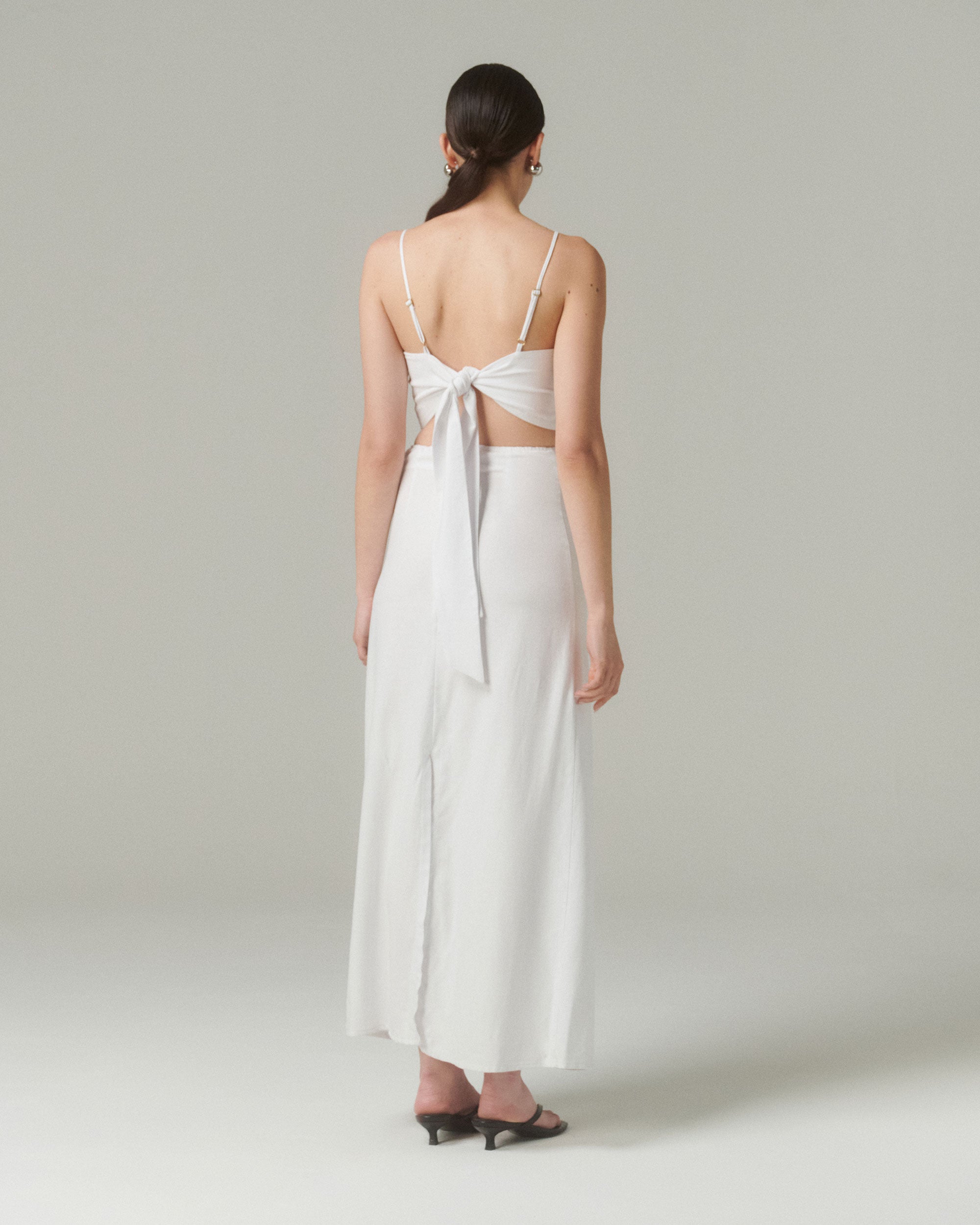 De escote recto y tirantes finos con breteles regulables, se adapta perfectamente gracias a su lazo ajustable en la espalda.