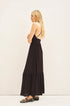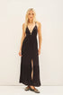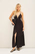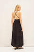 Vestido largo bretelero. Cuenta con un aplique metálico en escote. Espalda baja con breteles cruzados regulables y cierre invisible en cintura. Tiene un tajo central y volado ancho en ruedo.